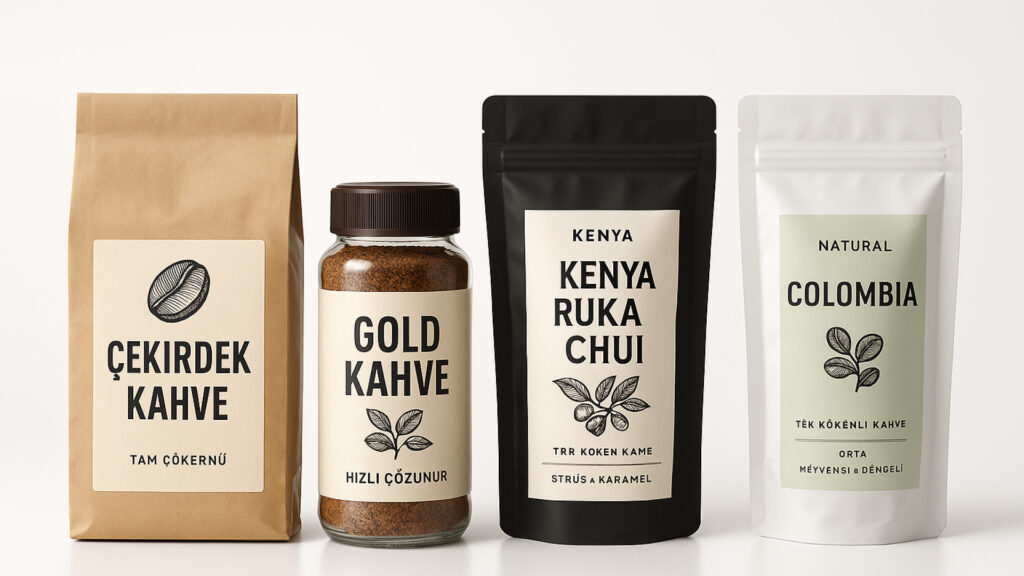Kahve etiketleri, ürünün kökenini, kavurma derecesini ve öğütme şekli gibi bilgileri içerir. Kahve çekirdekleri veya öğütülmüş kahveler için kullanılan bu etiketler, tüketiciye kahvenin kalitesi hakkında ipuçları verir. Kahvenin aromatik yapısını yansıtan şık ve modern tasarımlar, etiketlerde sıklıkla tercih edilir.